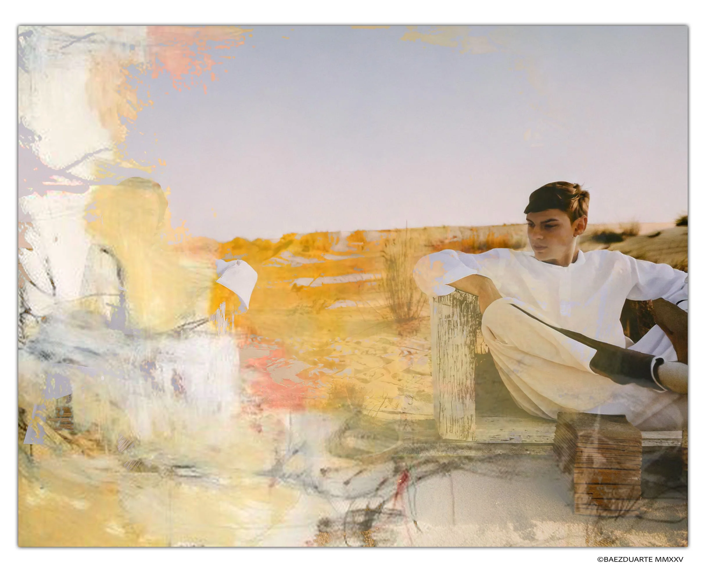 The second stage occurs in digital creation. The initial photograph, once processed in the algorithmic or Photoshop space, presents itself again saturated with easy solutions and algorithmic repetitions. There, again, the artistic gesture consists of introducing catastrophe: cuts, twists, overlays, and accidents that ruin the surface and allow the digital Figure to emerge — that which neither represents nor adorns, but makes one feel, unsettles, and transforms.